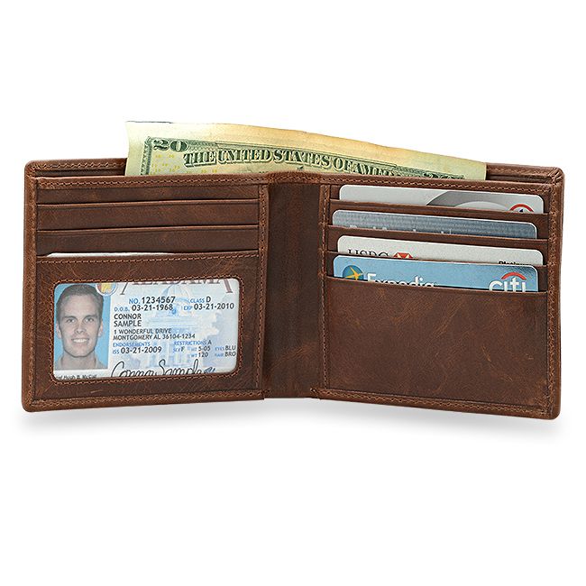 PRODUCT DESCRIPTIONCrafted from genuine antique brown leather, this slim bifold wallet combines classic style with modern security. Made from single sheets of soft yet durable leather, it features RFID-blocking technology, six credit card slots, an ID window, receipt pockets, and a double currency pocket that holds bills flat. Finished with free personalization and packaged in a gift box, it’s a timeless everyday essential.