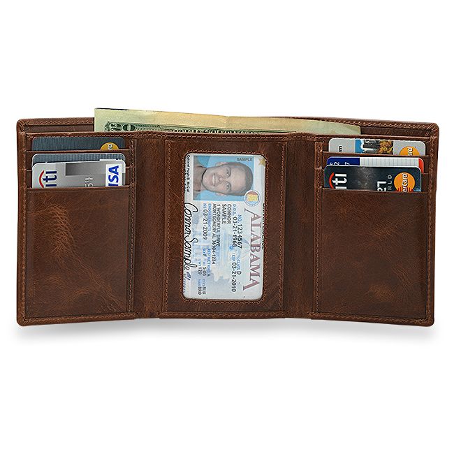 PRODUCT DESCRIPTIONMade from genuine antique brown leather, this classic trifold wallet offers a refined look with modern protection. Crafted from single sheets of soft yet durable leather, it features RFID-blocking technology, six credit card slots, a center ID window, three receipt pockets, and a double currency pocket designed to hold bills flat. Complete with free personalization and packaged in a gift box, it’s a stylish and practical everyday accessory.