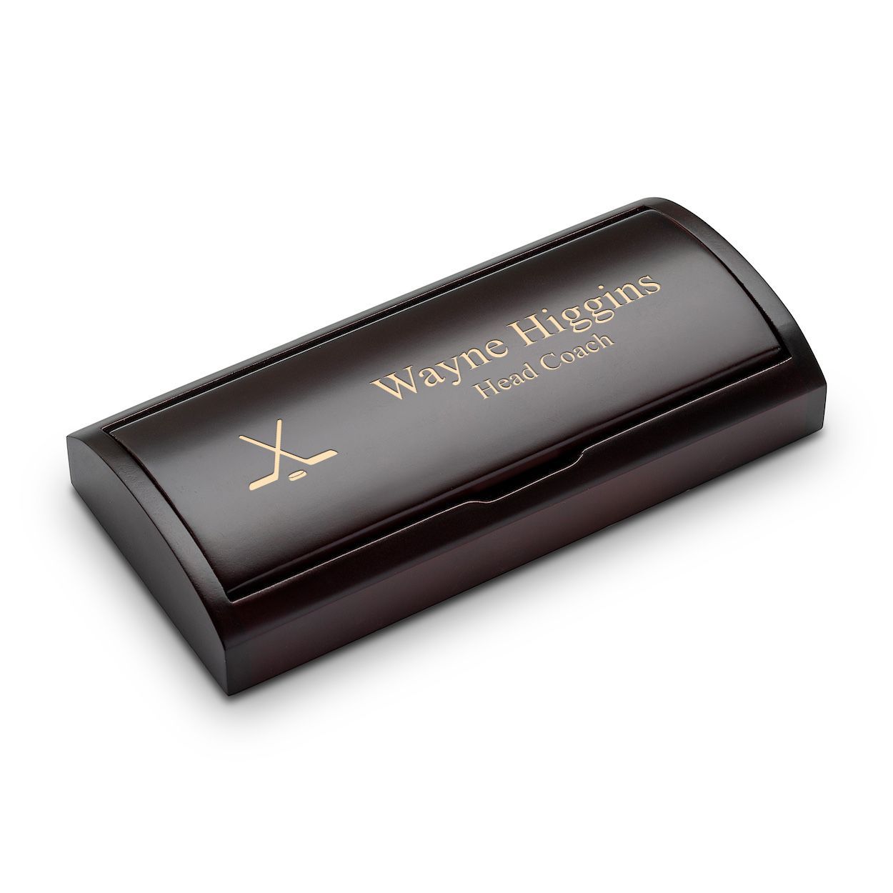 PRODUCT DESCRIPTIONAs the crowd cheers when the last puck is shot by the goalie and into the net, there are people to thank…the coach, the team, the sponsors. This ballpoint pen and mechanical pencil set are designed in black lacquer finish with gold-tone accents and feature a studded cap with pocket clip. They are set in an engravable wooden case that's laser-engraved with a hockey emblem and your personalized text, inscribed for free with your purchase. The set comes packaged in a gift box.< BR>