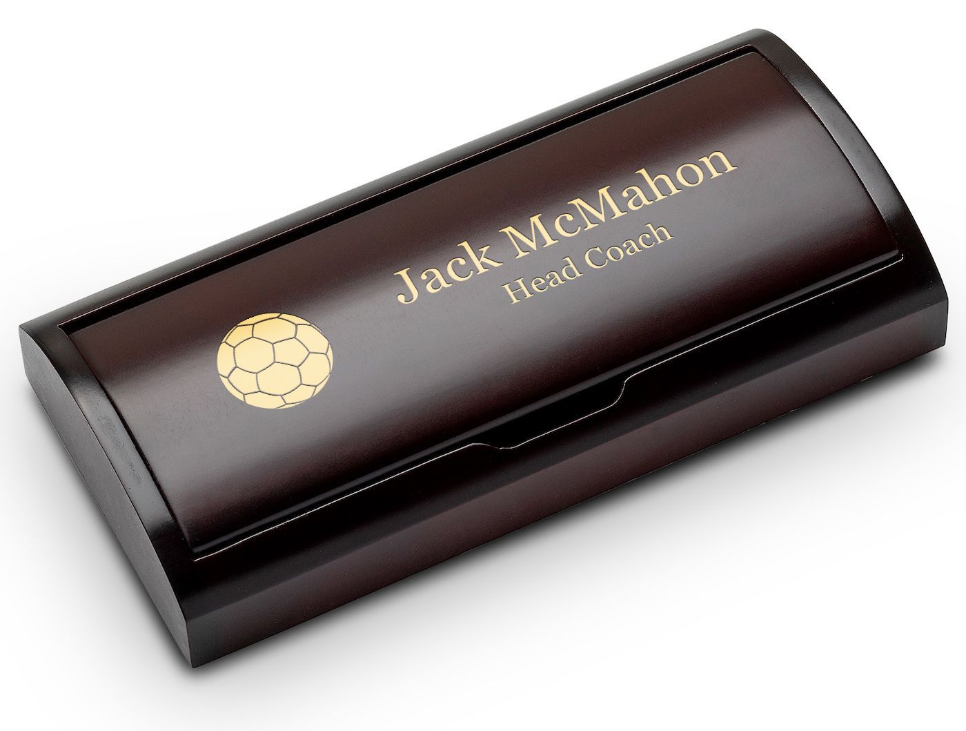 PRODUCT DESCRIPTIONThis elegant black lacquer barreled ballpoint and roller ball pen set are just the gift for a competitive soccer player on the professional or collegiate level, a coach, sponsor or fan. The pens are set in a wooden case that is laser-engraved on the cover with a soccer ball and leaves space to add free personalized text next to the emblem. The set comes packaged in a gift box.< BR>