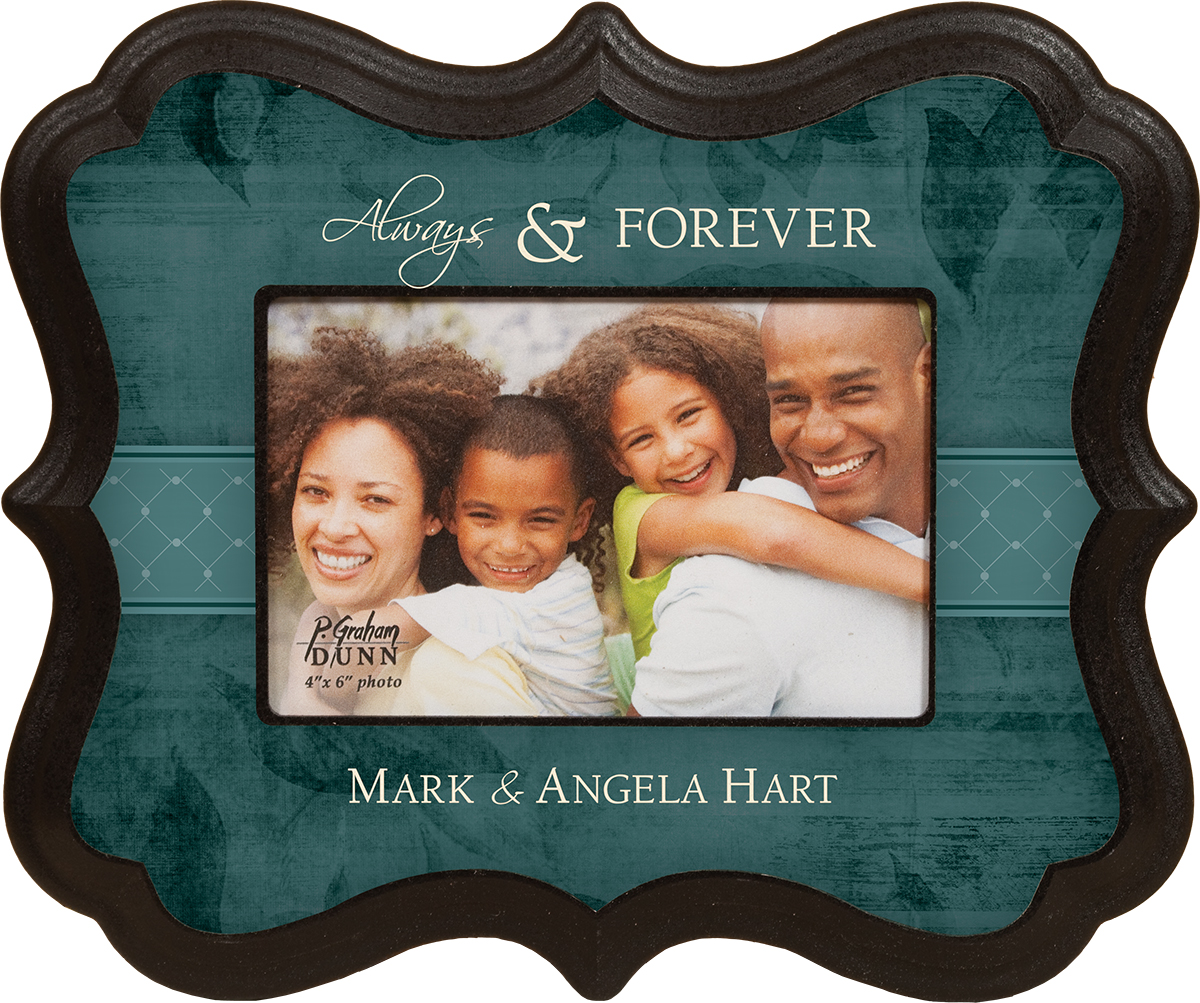 Let all who enter your home know that your love is Always & Forever with this personalized boutique style photo frame. Made of solid composite wood and coated in unique tones of blue and black, it also has a dramatic boutique style shape. It holds one 4" x 6" picture and includes the words "Always & Forever" across the top. Below the photograph, you'll add each of the recipients first names and their last name. Its an ideal frame for newlyweds, perfect for a housewarming gift and makes a great anniversary present for your significant other. It comes with a keyhole cut in the back so its ready to hang.