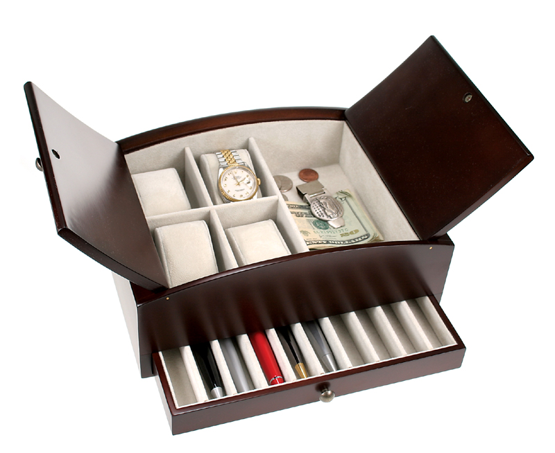 PRODUCT DESCRIPTIONThis elegant personalized keepsake box is the perfect vessel to hold your watches, pens and accessories. It's satin interior features 10 pen slots, 4 watch trays and another compartment for other small accessories, like cufflinks, bracelets or even spare change. With its rich espresso finish, it adds a touch of flair to any dresser. The felt bottom will keep any surface scratch free. Add a free laser engraving to the front for a uniquely personal touch.
