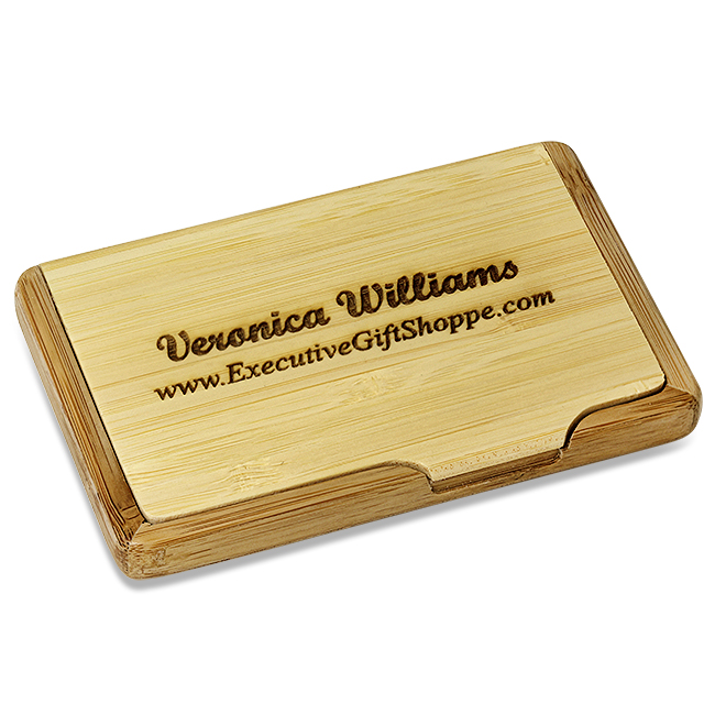 PRODUCT DESCRIPTIONOur personalized bamboo business card holder can be used both as a carry-around card holder or to display business cards on your desktop. Its made of renewable, environmentally friendly bamboo and has a two tone design. The front can be laser engraved with the inscription of your choice. Use it closed to carry around up to 8 business cards. Fold the cover all the way over and stand it on your desk to display your business card to potential clients. It has a slim design and a lightweight feel.