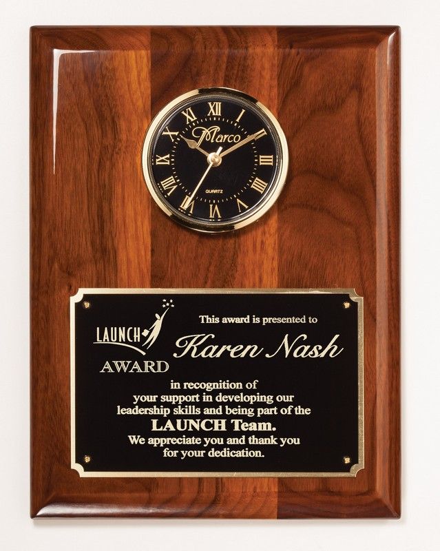 PRODUCT DESCRIPTIONThis sophisticated plaque features a piano-finish walnut frame, providing a sleek and polished look that enhances any space. An inlaid quartz clock with a gold frame sits at the center, featuring a black dial with gold Roman numerals and hands for a classic, timeless appeal. The combination of rounded edges and sharp corners adds a touch of refined craftsmanship. A black engraving plate with a gold border offers free personalization, making this plaque a perfect way to honor achievements, milestones, or special occasions. The rich walnut tones and elegant gold accents create a distinguished presentation piece that will be cherished for years. Designed for easy display, the back includes cutouts for secure wall hanging. Measuring 9" x 12" and packaged in a gift box, this plaque is ready to gift or display in an office, home, or ceremonial setting.