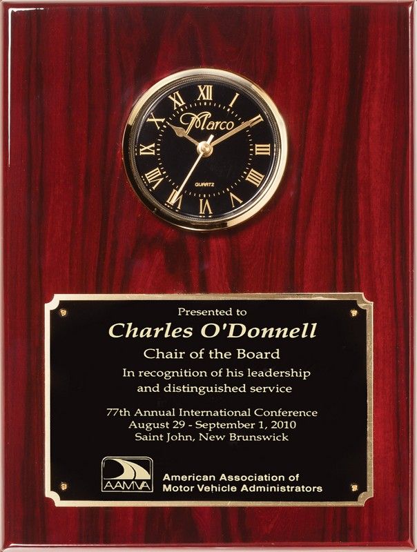 PRODUCT DESCRIPTIONThis elegant plaque is crafted from piano-finish rosewood-stained wood, offering a rich, polished appearance that exudes sophistication. At its center is an inlaid quartz clock with a gold frame, featuring a black dial with gold Roman numerals and hands for a classic, timeless look. Rounded edges paired with sharp corners add a refined touch of craftsmanship. A black engraving plate with a gold border provides space for free personalization, making this plaque an ideal way to commemorate achievements, milestones, or special occasions. The combination of deep rosewood tones and gold accents creates a distinguished presentation piece that will be treasured for years. Designed for effortless display, cutouts on the back allow the plaque to be securely hung on any wall. Measuring 10" x 13" and packaged in a gift box, it is ready to gift or display in an office, home, or ceremonial setting.