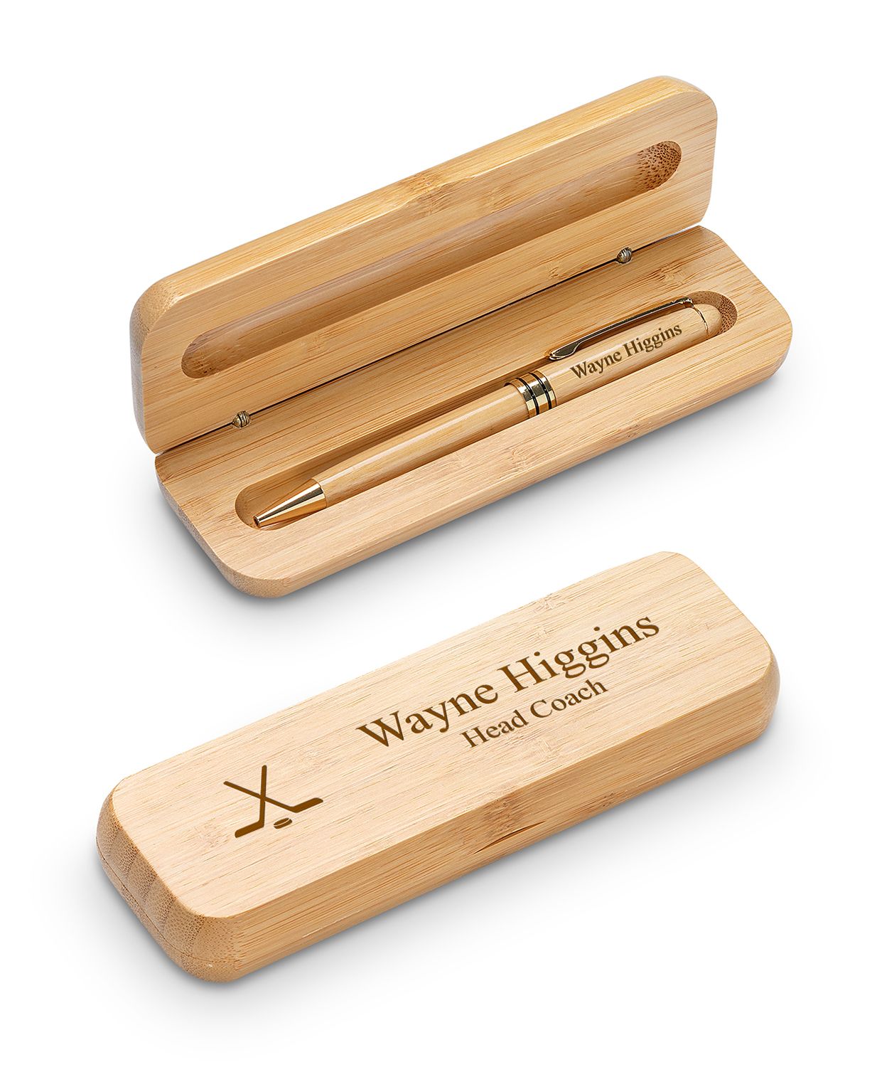 PRODUCT DESCRIPTIONCommemorate the moment when your team lights the lamp in the last game of the season with this handsome ballpoint pen set for the coach. The case is bamboo with laser-engraved crossed hockey sticks over a puck, and features a groove inside to hold a matching ballpoint pen with gold accents. Engrave the case, the pen, or both with a personalized message of up to 3 lines of text. The set comes packaged in a gift box, ready for presentation.