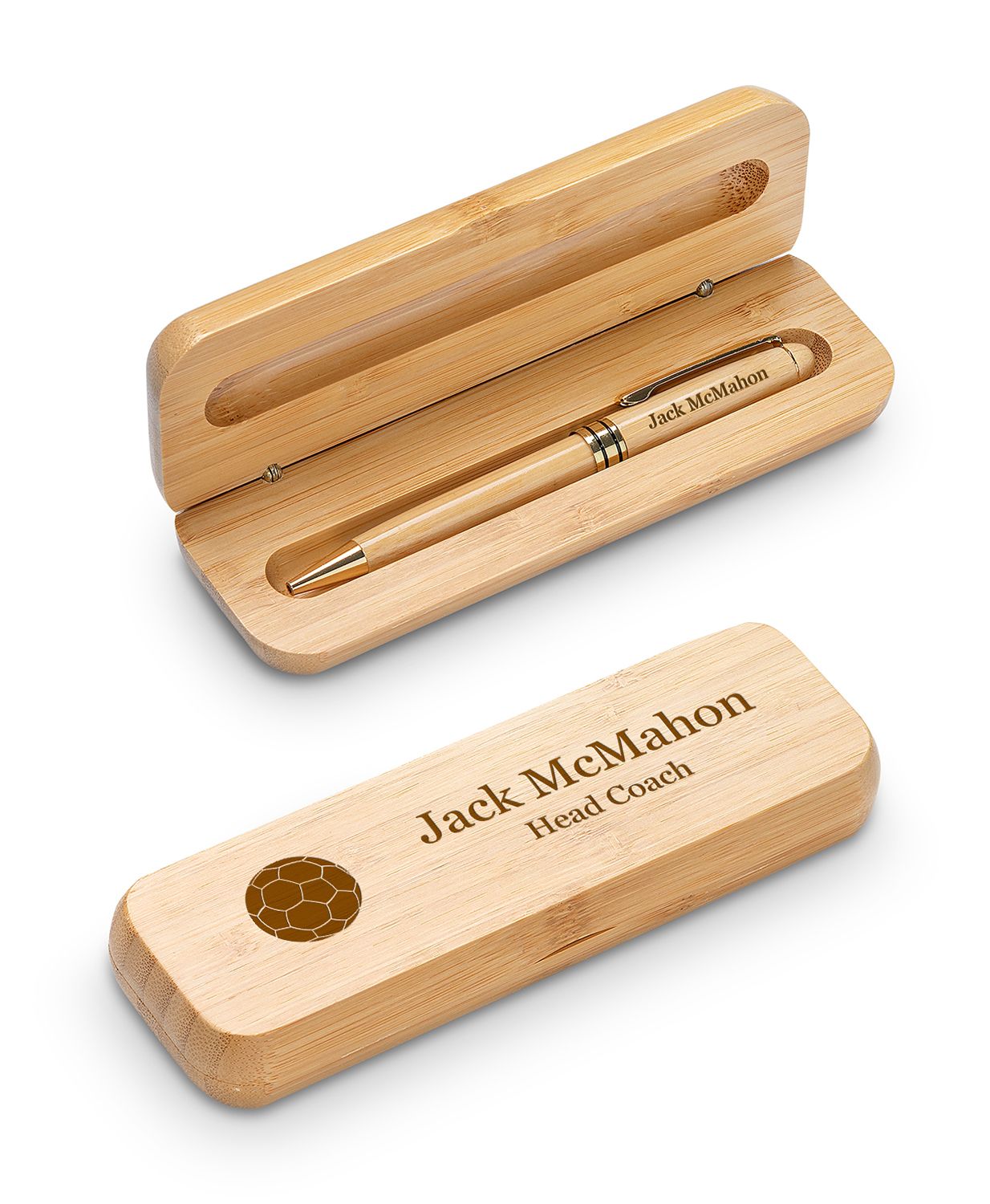 PRODUCT DESCRIPTIONWhen it comes to soccer, from the big game player to the goalie who pulled off a last-second save, it takes a team to win the game. Recognize your team, manager, or game MVP with this commemorative genuine bamboo pen set. A soccer ball is laser-engraved onto the case, with room for up to 3 lines of text, available on the case, pen or both. Personalization is free, and the set comes packaged in a gift box, ready for the Awards Night presentation.