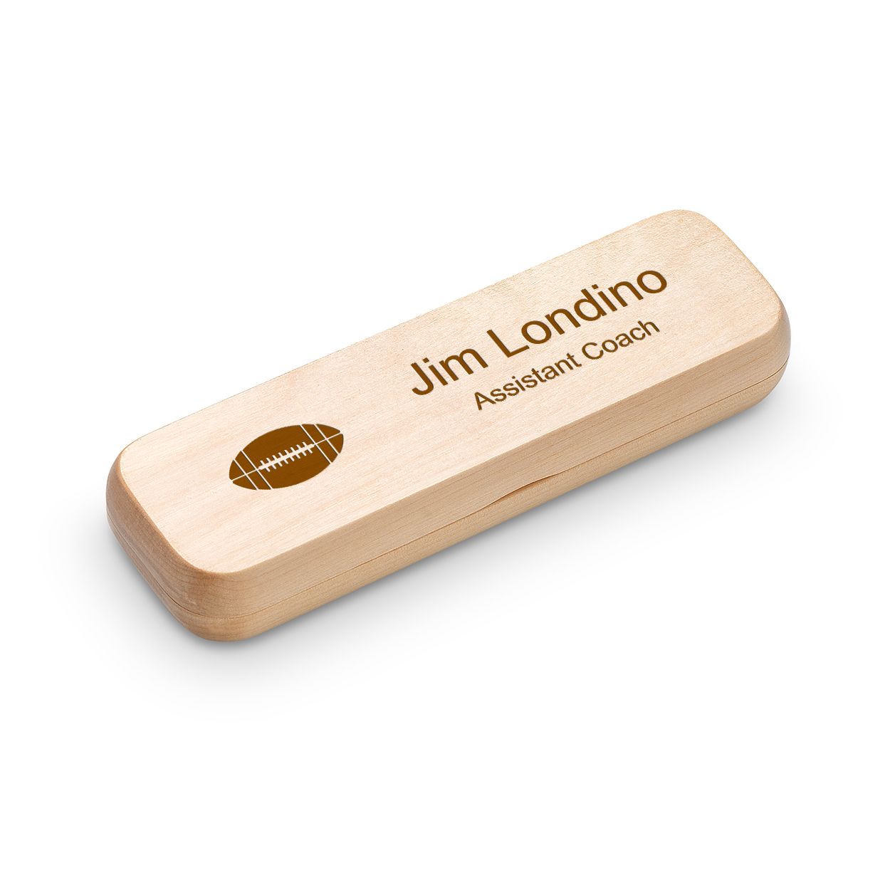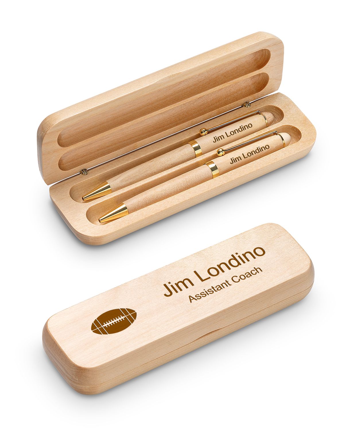 This genuine maple wood double ballpoint pen set combines natural elegance with everyday functionality. Featuring a light maple finish and classic gold accents, both pens offer smooth writing and a timeless design that suits any setting. The case is laser-engraved with a detailed football graphic on the left and your custom text to the right—perfect for honoring a coach, celebrating a winning season, or gifting a dedicated fan. Free personalization is available on the box, the pens, or both for a truly customized gift. Neatly packaged in a gift box and measuring 6 3/4" x 1 7/8" x 7/8", this set is an ideal keepsake for football players, coaches, or enthusiasts alike.