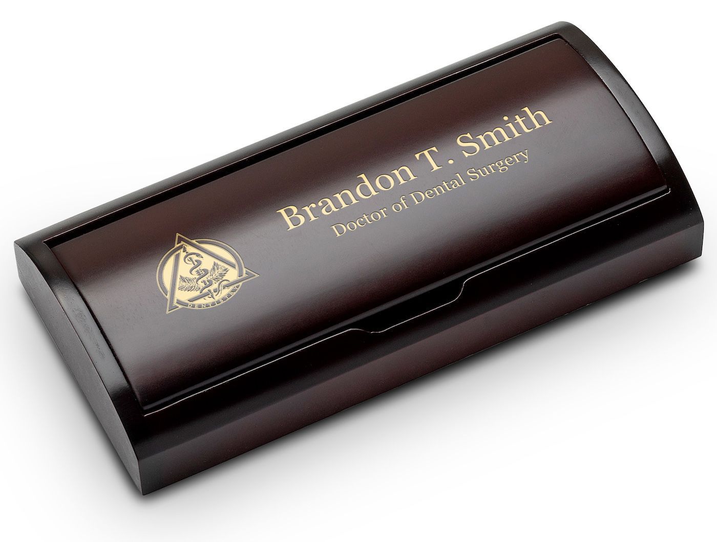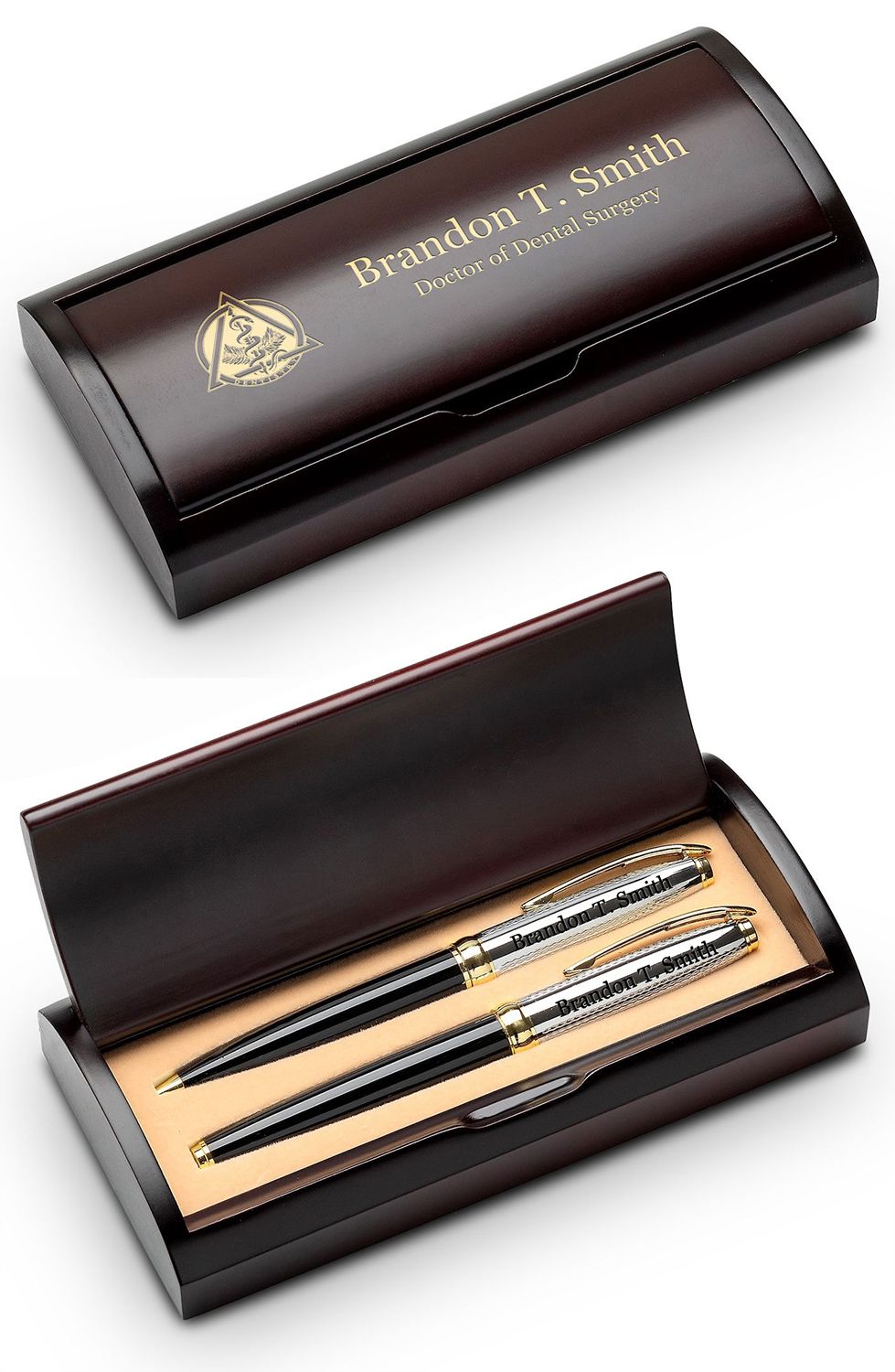 PRODUCT DESCRIPTIONAn elegant writing instrument is always the right choice for commemorating milestones with family and friends. For the dentist in your circle, here’s a black lacquer-barreled set of two pens, a ballpoint and a roller ball, encased in a hinged wooden desktop box. The cover features a laser-engraved Dentist symbol, and can be personalized below the symbol with laser-engraved text, available for free with your purchase. This set comes packaged in a gift box.