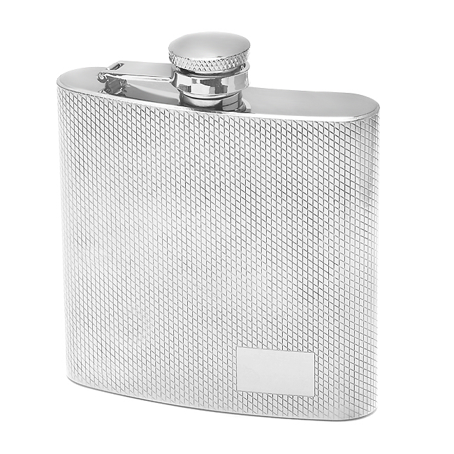 This six ounce engravable flask combines classic clean lines with an attractively textured surface, measuring up to the finely distilled spirits you choose to put inside. The body is covered in diamond shaped dimples that have a unique look and feel. Down on the bottom right hand corner of the front is a smooth, polished rectangle that you can have engraved with a name or initials free of charge. This patterned flask for men and women has a captive top that you can't lose and comes packaged in a gift box.