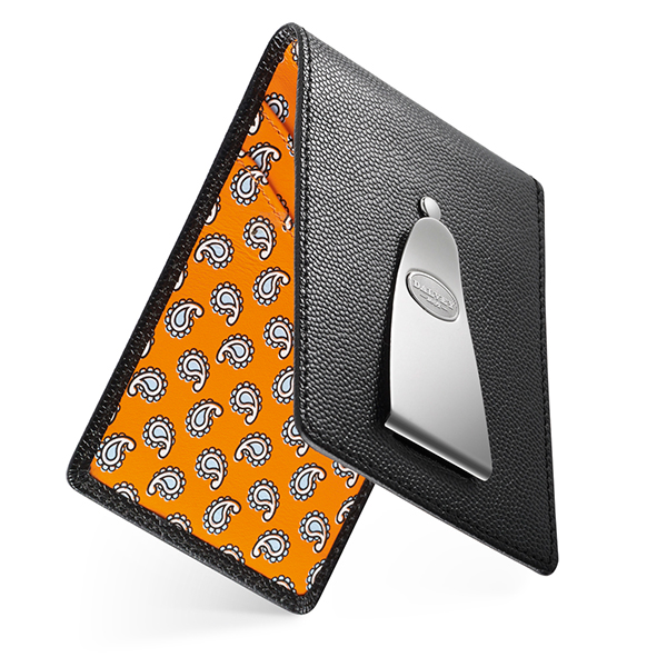 PRODUCT DESCRIPTIONThe elegant black caviar print leather with colorful lining in orange with light blue paisley pattern represents the on-trend design that Dalvey of London has provided for over 100 years! The billfold is designed for today's executive, with a streamlined style that has slots for 4 credit cards and an exterior French-fold money clip that holds up to 15 folded bills. This wallet is perfect for a business lunch, drinks with the guys, or Friday date night! It comes packaged in a Dalvey gift box, and ships within 1 business day!