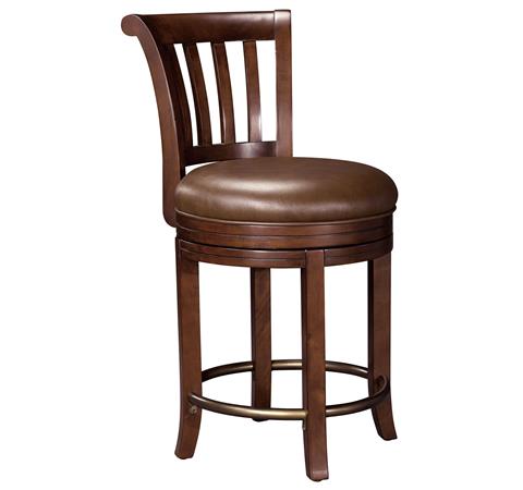 PRODUCT DESCRIPTIONAdd sophisticated Old World style to your entertainment area with this wood and leather pub stool by Howard Miller. The stool has a lightly-distressed finish in Hampton Cherry on select hardwoods and veneers, with a flared back and flared legs. An inset brown faux-leather seat cushion, and antique brass-finished metal footrest, add comfort and elegant style. A zero-return swivel is provided. The perfect choice for your man cave or home entertainment area, this stool will add the authentic pub accent you want!