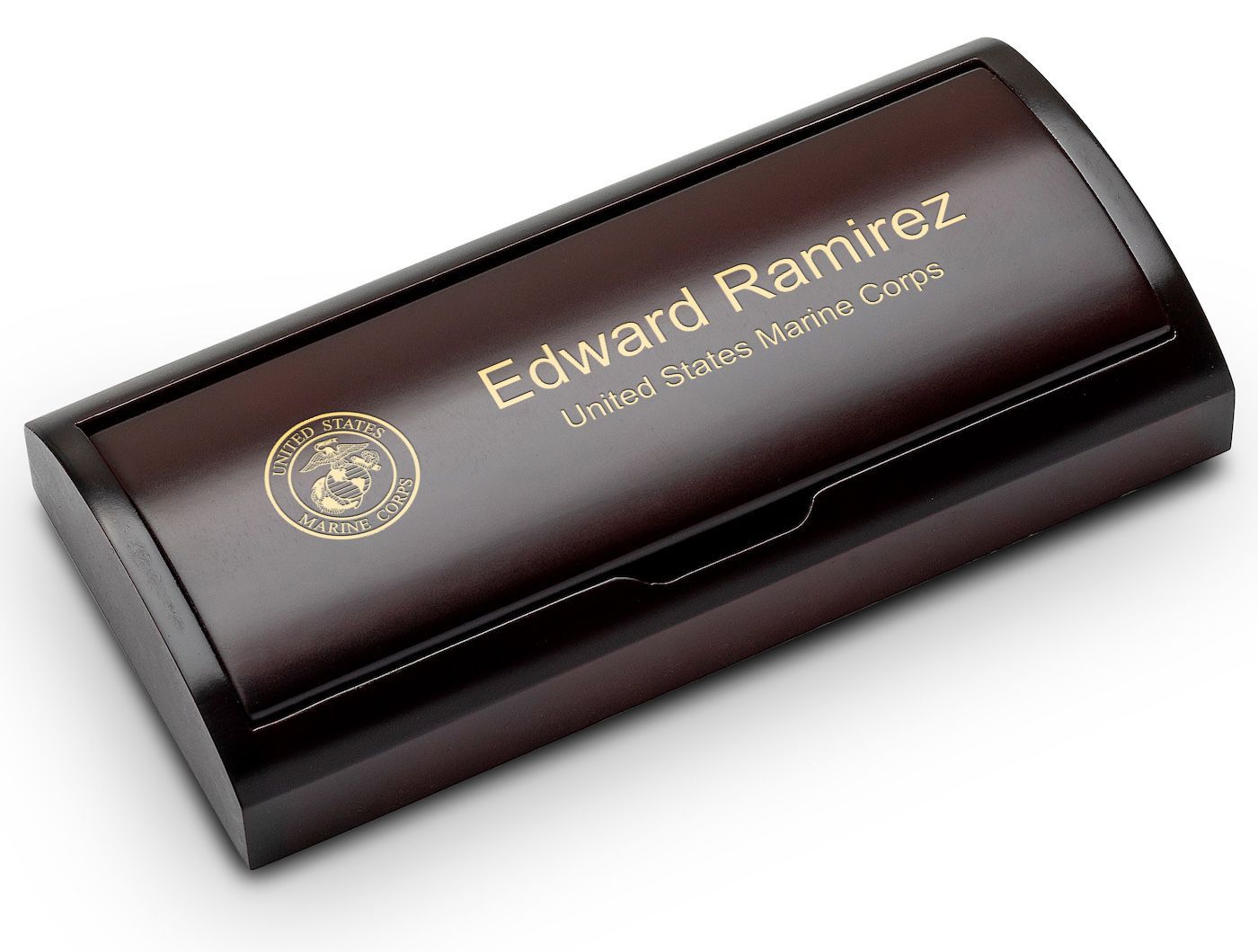 PRODUCT DESCRIPTIONPerfect for UnIt's States Marines veterans entering the workforce, this dual pen set will be the perfect addition to their new desk. It contains two pens, one ballpoint and one rollerball, each made of solid steel. They have a polished black lacquer coating and polished gold accents. They are cradled in a foam inlay with cutouts for each inside a wood presentation and holding box. Made of cherry finished wood, the box comes with the US Marines insignia laser engraved right into the arched lid. Below the symbol, add your own customized personalization free of charge.