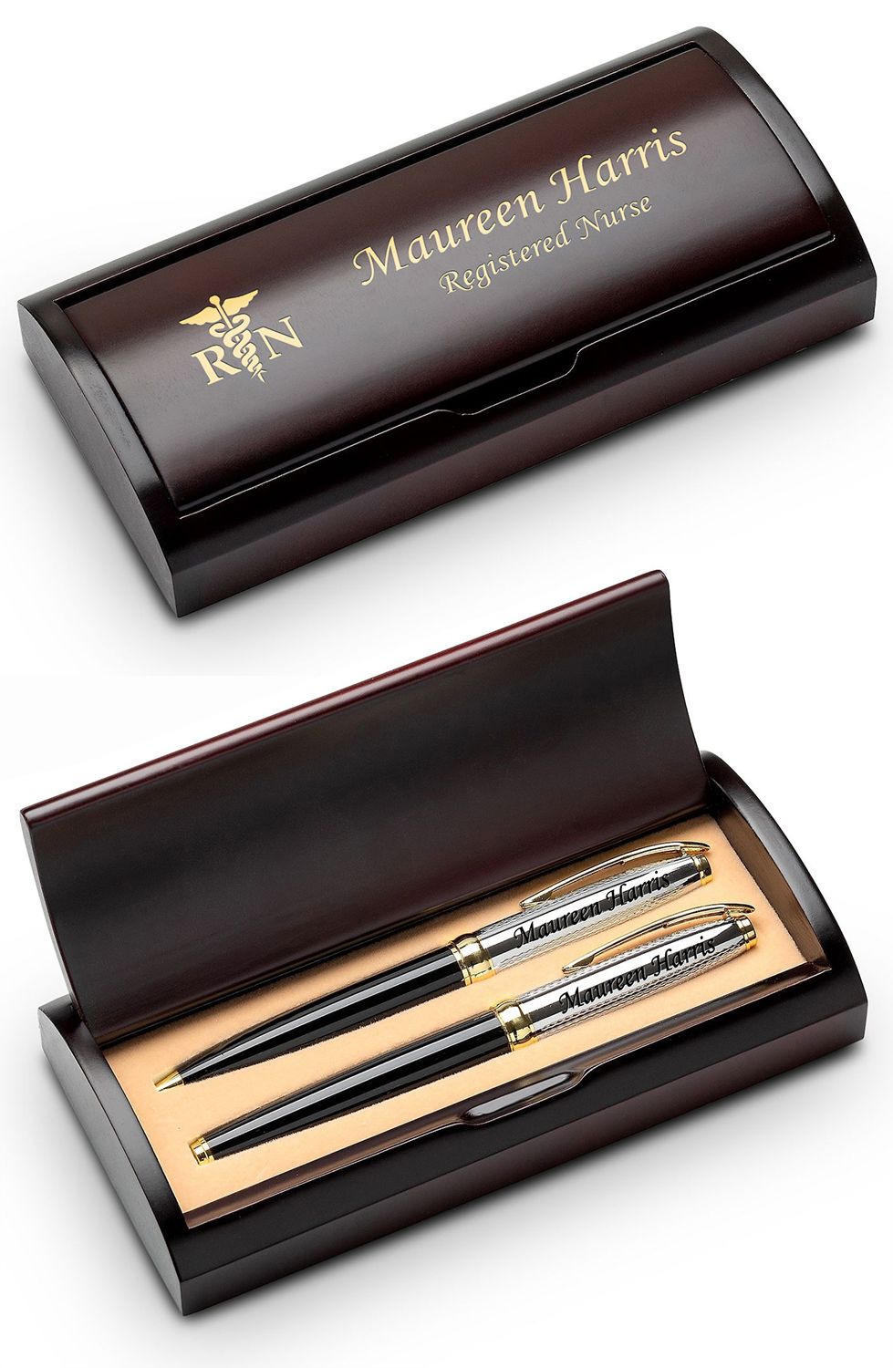 PRODUCT DESCRIPTIONPresent a gift that represents your admiration and respect for a hardworking nurse. This black lacquer-barrel ballpoint and rollerball pen set are held in an elegant wood presentation box that is laser-engraved with the emblem of the nursing profession. There's room to add free laser-engraved personalization to the right of the emblem. Ideal for any special occasion, achievement or milestone the pen set comes packaged in a gift box.