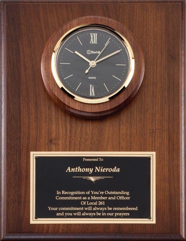 PRODUCT DESCRIPTIONThis elegant plaque is crafted from genuine walnut and features an inlaid quartz clock with a polished gold frame. The black dial, accented with gold Roman numerals and hands, provides a classic and sophisticated timepiece, while the combination of rounded edges and sharp corners adds a refined, professional touch. A black engraving plate with a gold border allows for free personalization, making this plaque an ideal way to commemorate achievements, awards, or special occasions. The warm walnut tones paired with gold accents create a timeless and distinguished presentation piece. Cutouts on the back make it easy to hang securely on any wall. Measuring 10" x 13" and packaged in a gift box, this plaque is ready to gift or proudly display in an office or home setting.