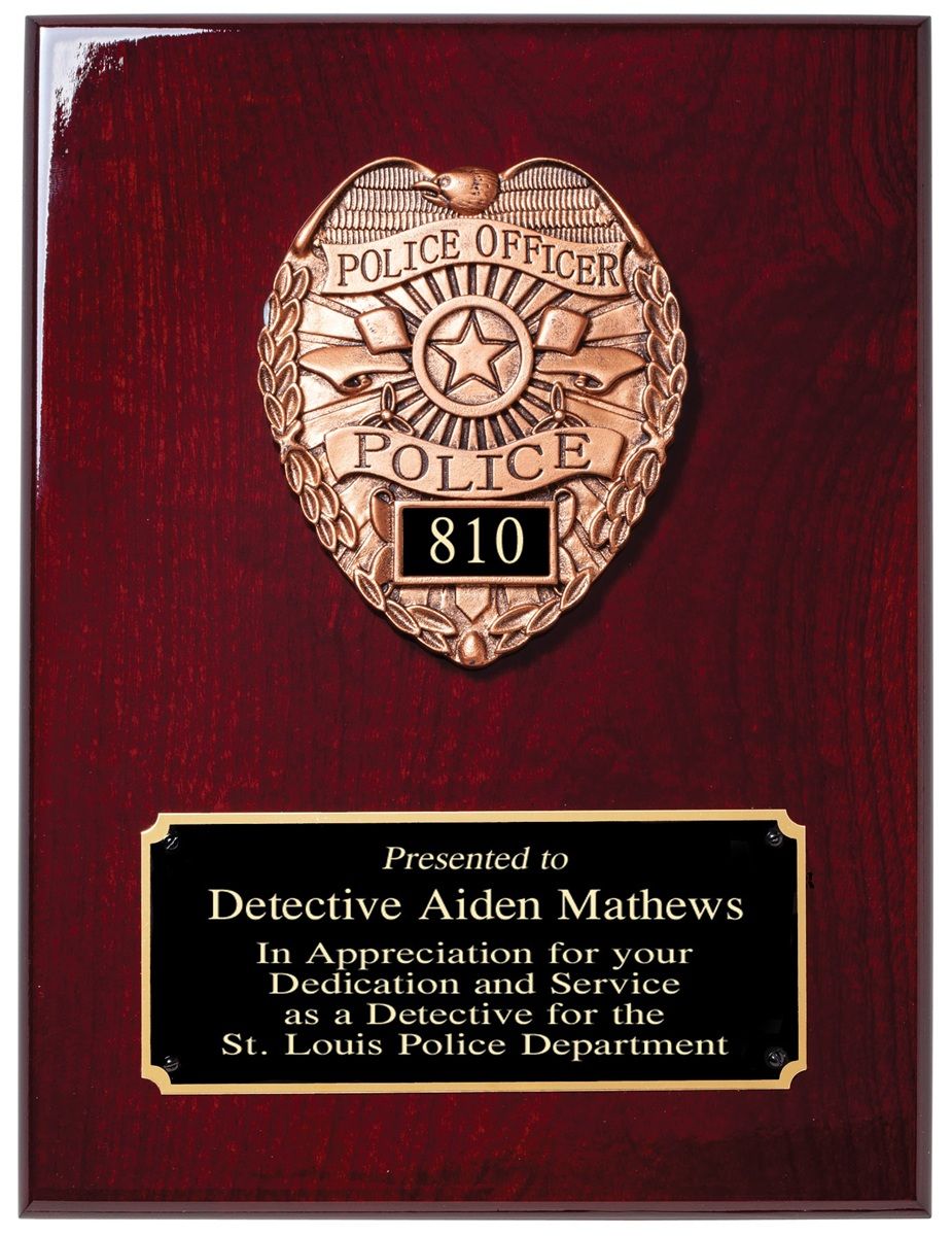 PRODUCT DESCRIPTIONThis solid wood plaque features a rich rosewood stain with a high-polish piano finish and sharp corners, creating a striking and professional presentation. The sleek design and deep finish give it a refined, timeless look. An antique rose gold–tone casting of a police badge serves as a proud focal point, honoring service and commitment. A black engraving plate with a gold border offers an elegant space for your message, with free personalization included on both the plaque and the black plate inside the badge. Designed with rear cutouts for easy wall hanging, this 9" x 12" plaque comes packaged in a gift box, ready for presentation or display.