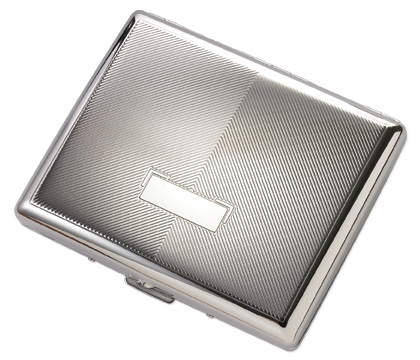 Add some style to your favorite smoker's ensemble with this custom engraved cigarette case. It holds both 100s and king size cigarettes. It has an ornately designed cover with opposing diagonal lines on either side that meet in the middle. These lines frame a smooth engraving area that you can have etched with initials or a name free of charge. Lightweight metal arms hold the cigarettes right where they should be until they're ready to be smoked.