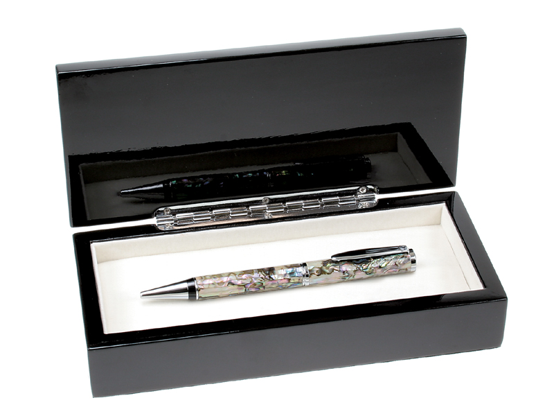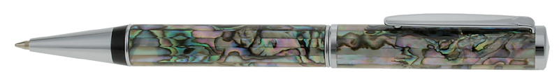 PRODUCT DESCRIPTIONThis elegant ballpoint pen is as much a work of art as it is a writing instrument. The interior chrome pen opens with a twist and wrIt's in smooth, clear lines. The exterior coating is made of luxurious mother-of-pearl and abalone with high polish chrome accents. This unique pen comes packaged in a carbon fiber gift box, which we'll be happy to laser engrave for you'ree of charge.