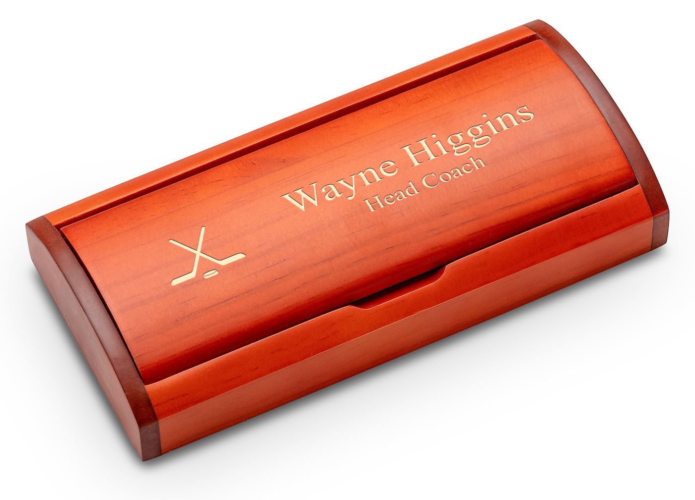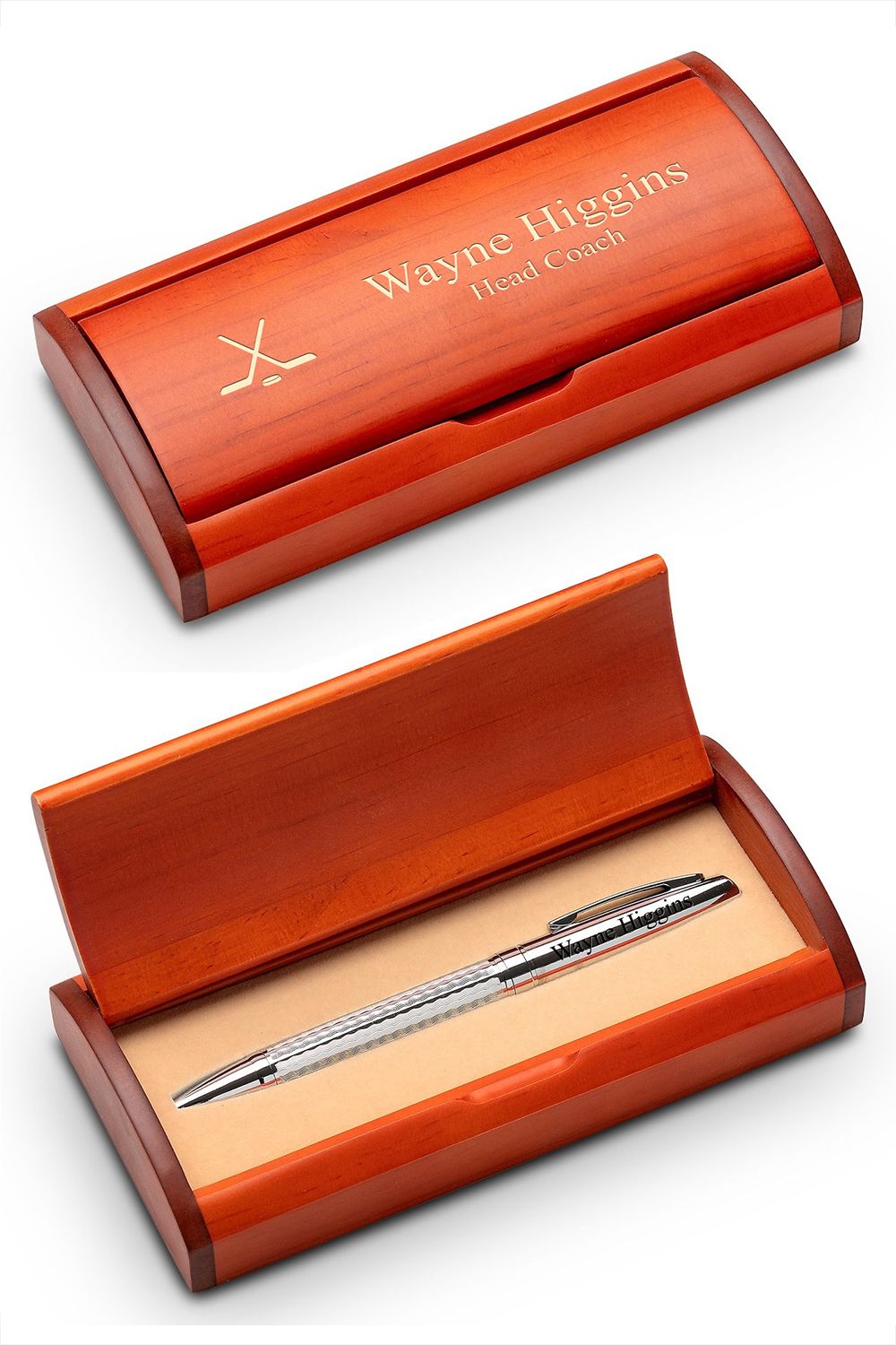 PRODUCT DESCRIPTIONHockey fans know that the sport is more than a bunch of guys randomly skating with sticks and getting into fights on the ice! It takes strategy and creative vision to score a goal! Score points with the hockey player or fan in your life with this classic ballpoint pen set. The pen is designed with a silver textured barrel with polished cap and a pocket clip, set in a rosewood case that is laser-engraved with a Hockey emblem. Laser-engraved personalization on the case and/or pen is free with your purchase. The set comes packaged in a gift box.