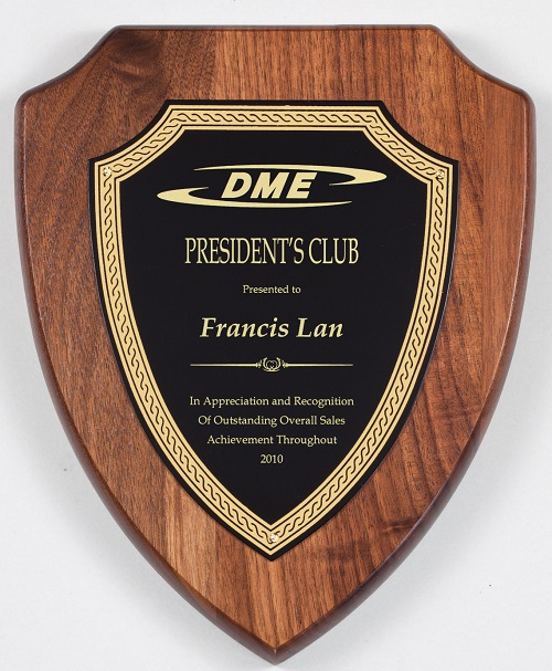 Let a special employee or coworker know just how valuable they are with this personalized commemoration plaque. Its made of solid walnut with a smooth satin finish. Its carved into the shape of a shield and has sharp edges with rounded corners. The wood base has an attached black and brass engraving shield. A thick gold, patterned border frames the black center engraving area. Add your logo and/or text here, laser engraved free of charge. Just check the Personalize It box to enter your text and the Add Logo box above if you'd like to attach a logo to your order. We email a proof for approval on all logo orders. This personalized shield style plaque is available in two sizes and comes packaged in a gift box.