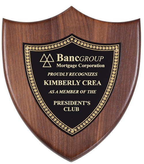 This shield shaped solid walnut plaque is ideal as a commemorative award or recognition award for a deserving employee or coworker. The walnut base is carved in the shape of a shield, complete with sharp corners and rounded edges. It includes a black and brass personalization plate with a matching shield shape. The plate has a smooth ebony finish with a decorative floral border. Add your free engraving to the center area on this plaque free of charge. Check the Personalize It box above and you'll be able to enter, customize and preview each line of text you'd like laser engraved. You can also add your company logo free of charge, we'll email you a proof for approval if you're adding a logo.